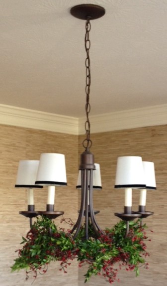 When decorating for the holidays – don’t forget the chandelier! Whether it’s located in the entry or dining room, it deserves a little adornment. It doesn’t need to be expensive or elaborate. A few small touches can make a big difference to the overall look and feel. I’m going to show you an inexpensive way to dress a plain dining room chandelier with just a few supplies: